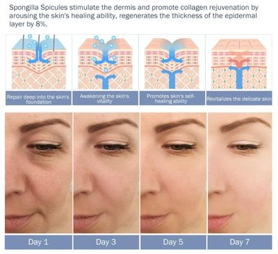 Introducing a groundbreaking innovation in aesthetic dermatology: SQT Bio-Microneedling. Derived from freshwater sponges, sponge spicules are siliceous biomicroneedles that stimulate the dermis and enhance skin surface microcirculation. These microneedles, resembling powder to the naked eye and crystal rods under the microscope, can be painlessly introduced into the dermis through a quick 5-minutes hand massage. With no bleeding, no skin breakage involved, SQT Bio-Microneedling delivers active ingredients and activates basal skin cells in the dermis layer. It accelerates the skin cycle from 28 days to just 7 days, achieving natural, safe, and effective physical rejuvenation.